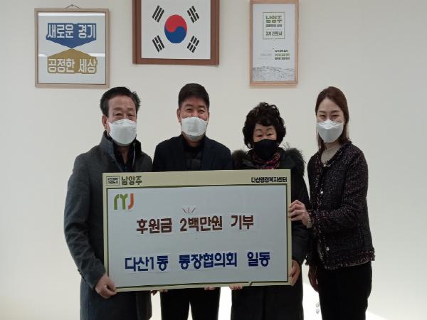 이에 김진현 다산행정복지센터장은 “2021년 신축년의 시작을 아낌없는 나눔으로 동참해 주신 통장협의회에 깊은 감사를 드린다”며, “우리 센터에서도 민관협력을 기반으로 지역사회 어려운 이웃을 살피고 지원하는 데 총력을 다할 것”이라고 감사 인사를 전했다.