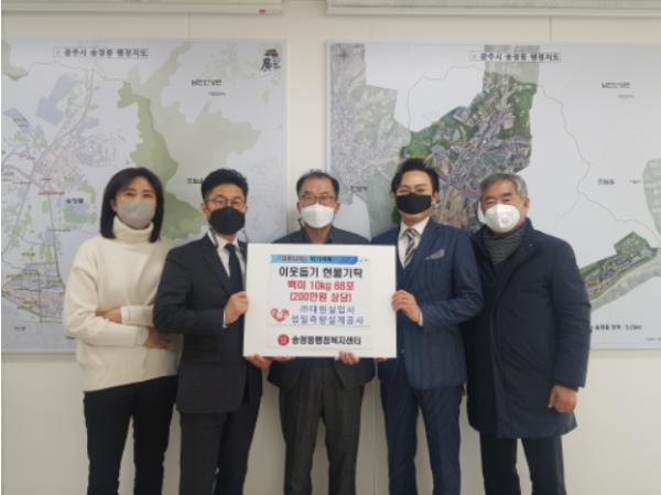 ㈜대원실업사 이찬호 대표와 성일측량설계공사 문병훈 대표는 지난 5일 송정동 행정복지센터를 방문해 어려운 이웃에게 전달해 달라며 백미 68포(10㎏·200만원 상당)를 기탁했다.