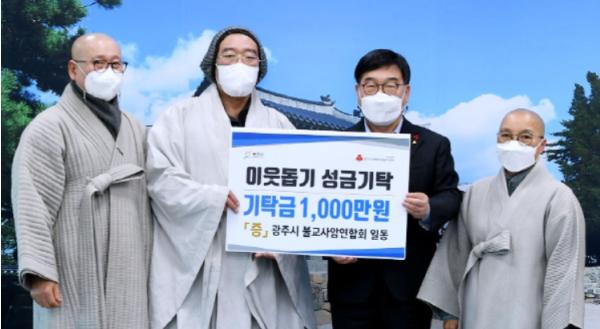 [KNT한국뉴스타임] 광주시 불교 사암연합회 회장 청호스님은 지난 5일 광주시청을 방문, 도움의 손길이 필요한 어려운 이웃에게 써 달라며 성금 1천만원을 기탁했다.