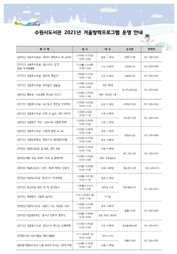 [KNT한국뉴스타임] 수원시도서관이 1~2월 유아·청소년을 대상으로 하는 ‘겨울방학 프로그램’을 온라인으로 운영한다.