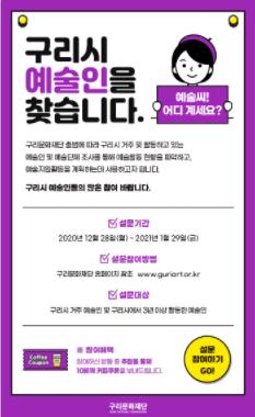 [KNT한국뉴스타임] 구리문화재단에서는 지난해 12월 28일부터 오는 1월 29일까지 구리시 거주 및 활동하고 있는 예술인 현황을 파악하고 포스트 코로나 시대 환경 변화에 맞는 예술인 지원체계 및 정책방향을 마련하기 위하여 예술인 실태조사를 진행하고 있다고 밝혔다.