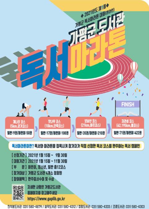 [KNT한국뉴스타임] 가평군은 신종 코로나바이러스 감염증(코로나19) 장기화로 지친 군민들의 마음을 위로하기 위해 책과 함께하는 제1회 독서 마라톤 대회를 연다.