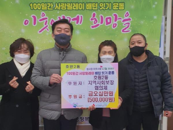 [KNT한국뉴스타임] 의정부시 호원2동 지역사회보장협의체는 1월 8일 100일간 사랑릴레이 동참을 위해 관내 어려운 이웃에게 전달해 달라며 성금 50만 원을 기탁했다.