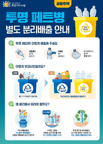 이에 따라 수원시 내 공동주택에 거주하고 있는 각 가정에서는 음료와 생수 등이 담겼던 투명 페트병을 별도의 수거함에 분리배출 해야 한다.