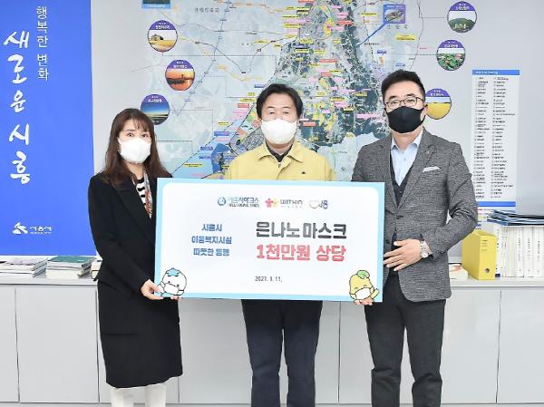 시흥시(시장 임병택)에 따뜻한 마음이 전달됐다. ㈜에프지아크스는 1월 11일 관내 아동복지시설을 위해 1천만 원 상당의 은나노 마스크를 기부했다.