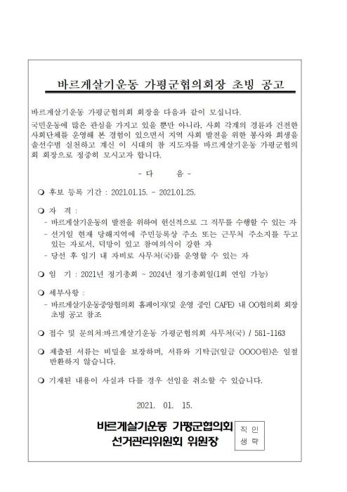 바르게살기운동 가평군협의회 회장을 다음과 같이 모십니다.