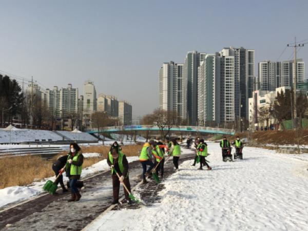 [KNT한국뉴스타임] 의왕시는 수도권 등 중부지방에 많은 눈이 내린 13일 지역자율방재단 단원 30여명이 청계동 학의천 산책로에서 굵은 땀방울을 흘리며 제설작업을 실시했다고 밝혔다..