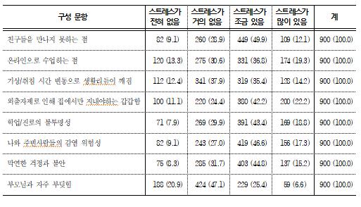 온라인 수업 진행에 대해서는 중학생의 스트레스 정도가 고등학생보다 더 심했으나 학업/진로 불투명성에서 비롯되는 스트레스는 도시, 고등학생, 여학생에게서 더 두드러졌다.