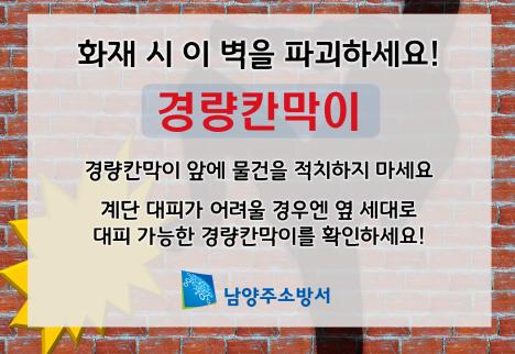 [KNT한국뉴스타임] 남양주소방서는 아파트 화재 등 긴급 상황 시 탈출을 위한 대피 시설인‘경량칸막이’의 홍보에 나섰다고 밝혔다.