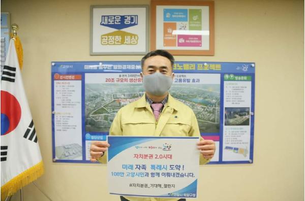 이날 김 구청장은 이길용 고양시의회 의장과 김훈래 자치분권협의회 부의장의 지목으로 챌린지에 참여해, ‘미래 자족 특례시 고양, 108만 고양시민과 함께 이뤄내겠습니다’라는 메시지를 전하며 진정한 주민 주권 실현을 앞둔 기대감을 드러냈다.