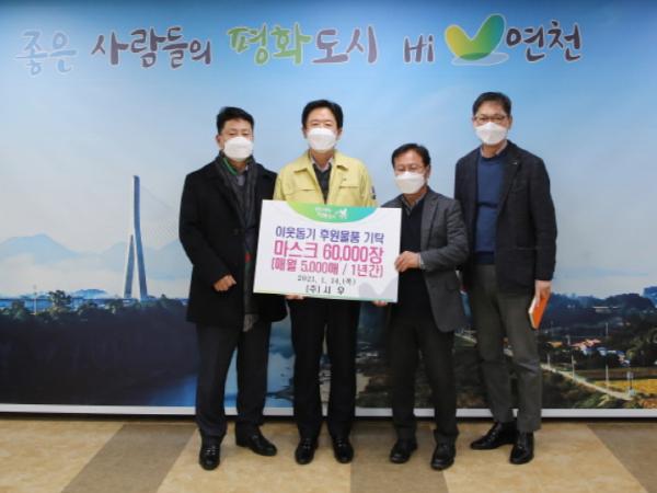 [KNT한국뉴스타임] 연천군은 ㈜시우에서 지난 14일 군청을 방문하여 관내 저소득장애인과 사회복지시설에 지원하고자 마스크 60,000장(매달 5,000장 / 1년간)의 후원물품을 기탁했다고 밝혔다.