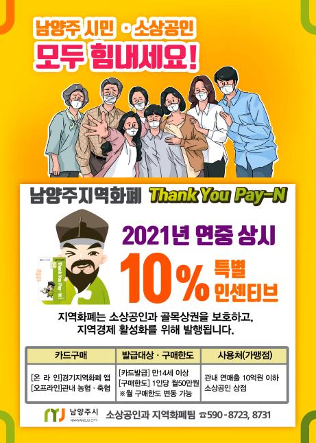 [KNT한국뉴스타임] 남양주시가 코로나19 장기화로 침체된 지역 경제와 골목 경제 활성화를 위해 2021년 남양주지역화폐(Thank You Pay-N)를 1,243억 원 규모(일반발행 1,150억, 정책발행 93억)로 확대 발행하고, 연중 상시 10% 특별인센티브를 지급한다.