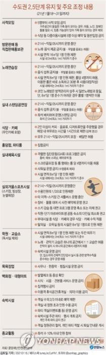 또 거리두기 조치에 따라 수도권에서는 결혼식, 장례식, 기념식 등도 지금처럼 50인 미만, 비수도권에서는 100명 미만으로 인원이 제한된다.