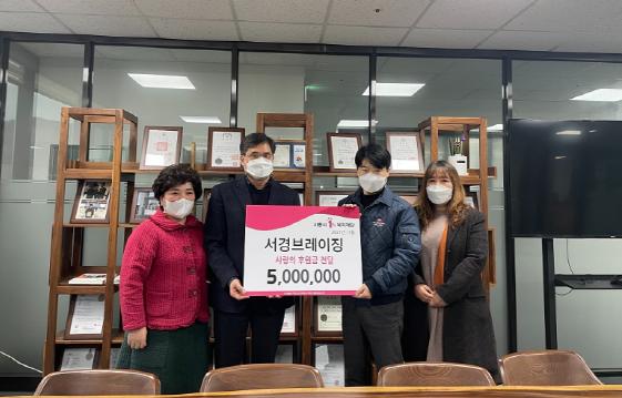 [KNT한국뉴스타임] 시흥시 서경브레이징(대표 신영식)은 15일 신천동 지역사회보장협의체(공공위원장 김병철, 민간위원장 정미순) ‘행복마을’에 후원금 300만원, ‘복지세상미래’에 200만원, 총 500만원을 지정 기탁했다.