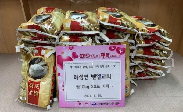 하성면에 위치한 벧엘교회는 신축년 새해를 맞아 어려운 이웃들에게 전달해 달라며 백미 10kg 30포를 기탁하였다. “작년 한해는 누구에게도 쉽지 않은 한해였지만, 새로운 한해 따뜻한 밥 한술에 힘을 내어 어려움을 이겨내고 희망을 찾아가는 한해가 되었으면 좋겠다”며 기탁 의사를 밝혔다.