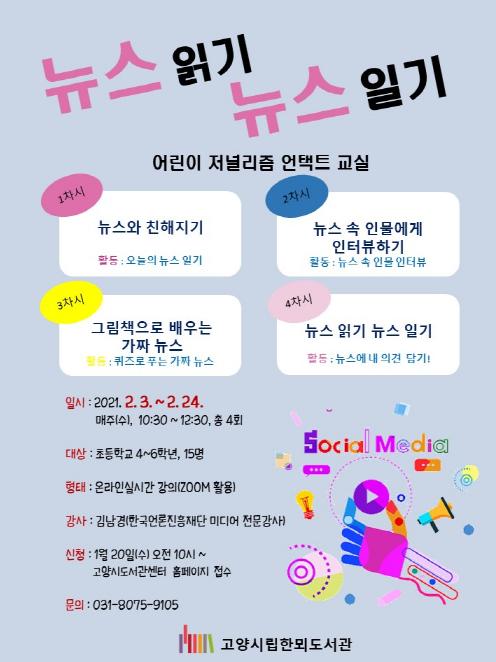 [KNT한국뉴스타임] 고양시 한뫼도서관이 겨울방학을 맞은 초등학생들을 대상으로 어린이 저널리즘 언택트 교실 ‘뉴스 읽기, 뉴스 일기’를 운영한다.