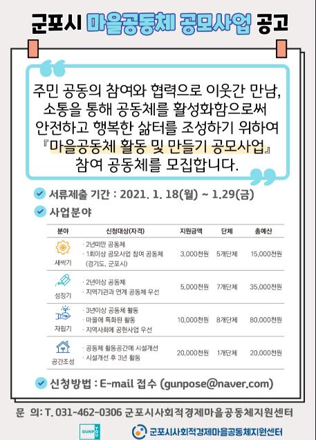 군포시청 관계자는 “주민들의 참여와 협력을 바탕으로 만남과 소통을 통해 공동체를 활성화해서 행복하고 신명나는 삶터를 조성하기 위한 이번 사업 공모에 많은 신청을 바란다“고 말했다.