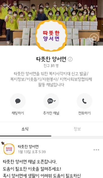 ‘따뜻한 양서면’ 채널을 구독하면 누구나 1대1 채팅으로 복지 위기가구에 대한 제보가 가능하며, 바뀐 복지정보나 생활정보도 주기적으로 제공 될 예정이다. 현재 채널에서는 21년에 달라지는 복지제도, 코로나19 생활지원비 관련 정보 등을 확인할 수 있다.