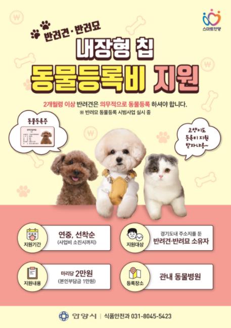 [KNT한국뉴스타임] 안양시가 정부시책에 따라 반려동물에 대한 내장형 칩 동물등록비 지원을 확대한다고 19일 밝혔다.