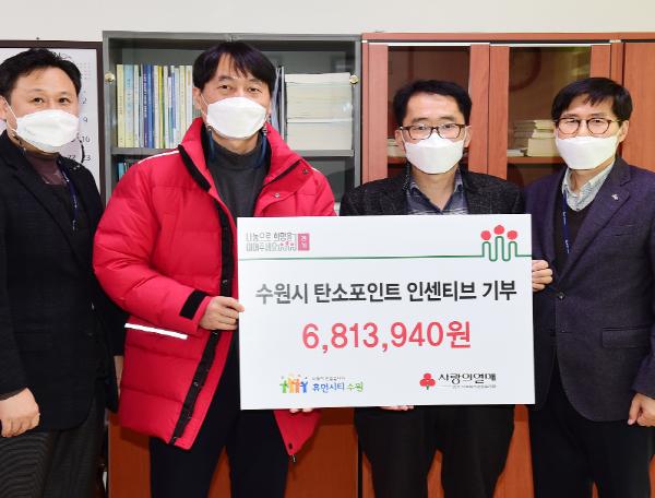 성금은 탄소포인트제 참여자 중 전기·수도·도시가스 사용량을 줄여 인센티브를 지급받은 수원시민들의 기부로 마련됐다.