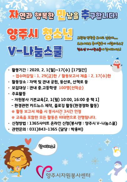 [KNT한국뉴스타임] 양주시자원봉사센터는 오는 2월 1일부터 17일까지 ‘2021 양주시 청소년 V-나눔스쿨’을 운영한다.