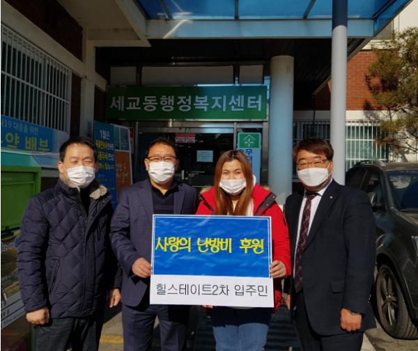 [KNT한국뉴스타임] 세교동 힐스테이트 평택2차 입주자대표회는 20일 평택시 세교동행정복지센터에 저소득층 가구를 위해 써달라며 사랑의 난방비를 전달했다.