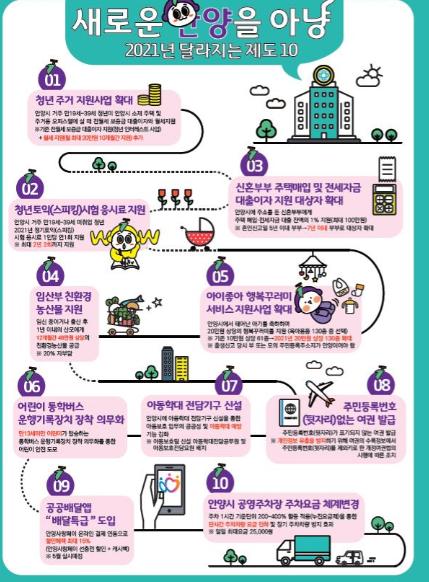 특히 안양에 거주하고 있는 청년과 신혼부부, 아동을 위한 새로운 제도가 많이 신설되어 청년이 찾아오는 도시, 가족의 삶을 책임지는 도시, 안양의 젊은층을 위한 노력이 엿보인다.