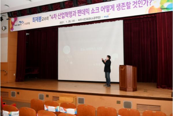 [KNT한국뉴스타임] 파주시는 지난 20일 오후 3시 '포노사피엔스 코드 CHANGE 9(체인지 나인)'의 저자인 성균관대학교 기계공학부 최재붕 교수를 초청해 ‘4차 산업혁명과 팬데믹 쇼크 어떻게 생존할 것인가?’라는 주제로 2021년 1월 수요포럼을 개최했다.