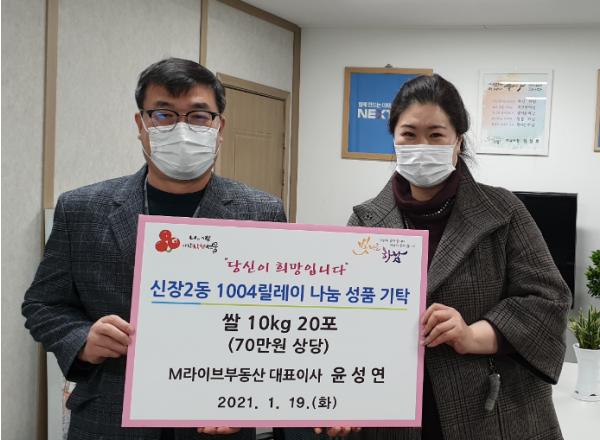 [KNT한국뉴스타임] 하남시 신장2동 윤성연(M라이브부동산 대표이사)씨가 19일 70만원 상당의 쌀(10kg) 20포를 동 행정복지센터에 기탁했다. 윤 씨는 “코로나 사태가 길어지면서 생활에 곤란을 겪는 이웃들이 주변에 눈에 띄게 늘어나는 것을 보면서 조금이나마 도움이 되고자 나눔을 결심했다”고 말했다.