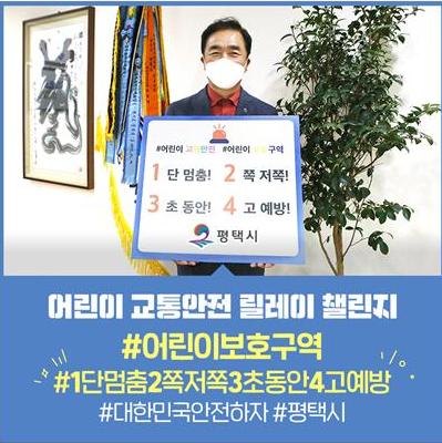 [KNT한국뉴스타임] 정장선 평택시장이 최근 어린이보호구역 내 교통안전을 응원하는 ‘어린이 교통안전 릴레이 챌린지’에 동참했다.