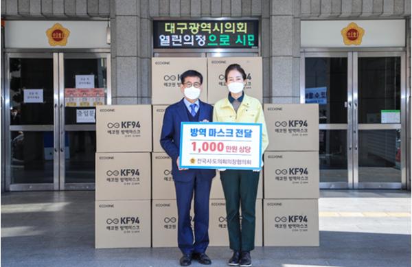 전국시?도의회의장협의회(회장 신원철)는 코로나바이러스 감염증-19(이하 코로나19) 피해로 인해 특별재난지역으로 선포된 대구·경북 지역에 지원하고자 마스크 14,000여장을 구매하여, 금일 대구광역시 의회에 7,000여장을 전달하고 나머지도 경북도의회에 금주 중 전달할 예정이다.