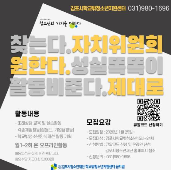 [KNT한국뉴스타임] 김포시청소년재단 학교밖청소년지원센터는 청소년이 직접 센터 운영 및 각종 프로그램 등의 자문·평가에 참여해봄으로써 청소년의 참여의식을 확대하기 위한 자치기구 ‘별하’의 위원을 25일부터 모집한다.