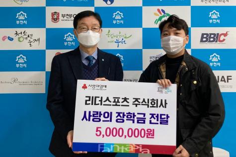 [KNT한국뉴스타임] 부천시가 지난 27일 리더스포츠 주식회사(대표 허유석)에서 저소득 취약계층 청소년을 지원하기 위해 장학금 500만 원을 기탁했다고 밝혔다.