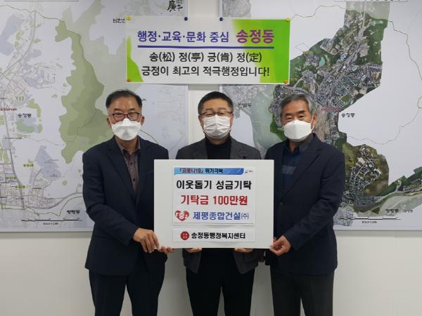 [KNT한국뉴스타임] 제평종합건설㈜ 구자경 대표이사는 지난 26일 광주시 송정동 행정복지센터를 방문해 어려운 이웃에게 전달해 달라며 성금 100만원을 기탁했다.