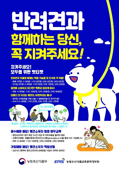 기존 맹견의 소유자는 2월 12일 까지, 신규 소유자는 맹견을 소유하는 날 보험에 가입해야 하며, 보험 만료일 이전까지 보험을 갱신해야 한다. 위반 시는 300만원 이하의 과태료가 부과된다.