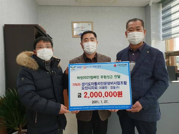 오산시 차량등록사업소(소장 이정묵)는 지난 27일 경기도 자동차전문정비사업조합 오산시지회(지회장 강동구) 회원들이 이웃돕기 성금으로 200만 원을 기탁했다고 밝혔다.