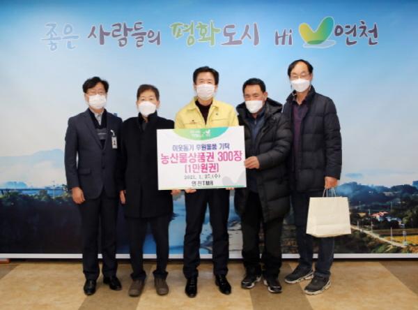 [KNT한국뉴스타임] 연천군은 연천축산영농조합법인 연천TMR에서 지난 27일 군청을 방문하여 연천군 저소득층과 소외된 어려운 이웃에게 지원하고자 농산물상품권 300장(300만원 상당)의 후원물품을 기탁했다고 밝혔다.