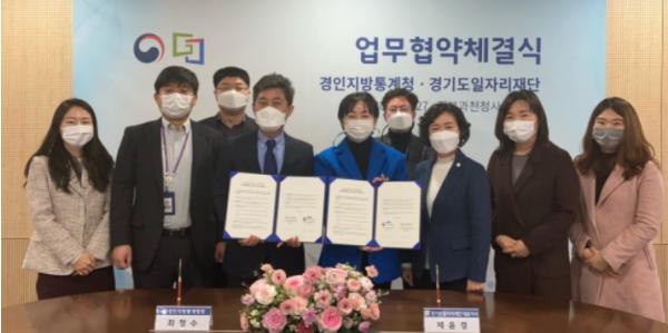 [KNT한국뉴스타임] 경기도일자리재단과 경인지방통계청이 27일 과천 경인지방통계청 대회의실에서 제윤경 경기도일자리재단 대표이사, 최정수 경인지방통계청장 등이 참석한 가운데 ‘중장년 경력단절여성을 위한 통계조사원 양성’ 업무협약을 체결했다.
