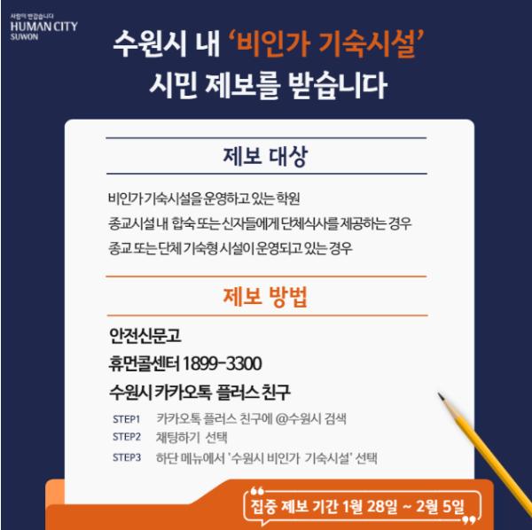 수원시는 3밀(밀폐·밀집·밀접) 환경인 비인가 시설의 집단감염을 선제적으로 차단하기 위해 법적 테두리 밖에 있는 ‘비인가 기숙 시설 (학원·종교·단체 시설)’에 대한 시민제보를 받기로 했다.