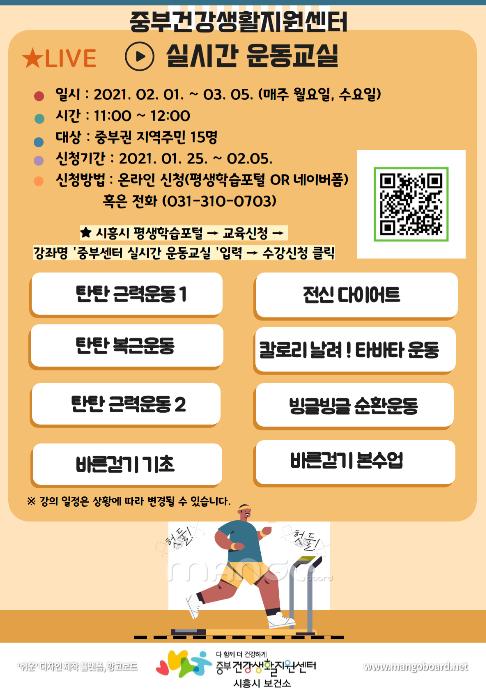 시흥시보건소 관계자는 “중부권 지역주민이 온라인 운동교실 참여를 통해 코로나19로 지친 일상을 회복하고 삶에 활력을 찾길 바란다” 고 전했다.