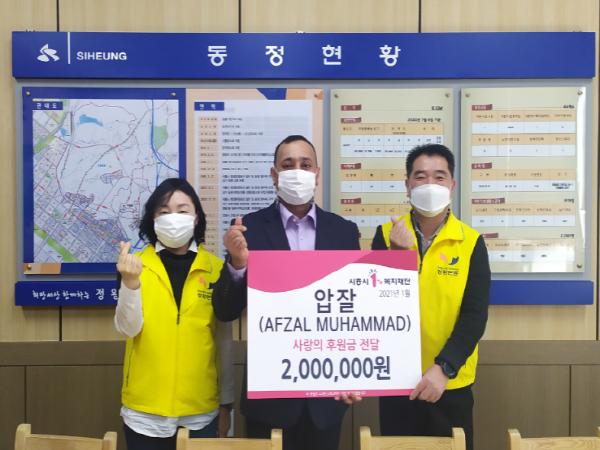 [KNT한국뉴스타임] 정왕본동에 거주하는 파키스탄인 압잘씨(AFZAL MUHAMMAD, 정왕본동 외국인 자율방범대 소속)는 지난 1월 27일 정왕본동 행정복지센터를 찾아 코로나19등의 이유로 경제적으로 어려움을 겪고 있는 저소득층을 위해 써 달라며 200만원을 기탁했다.