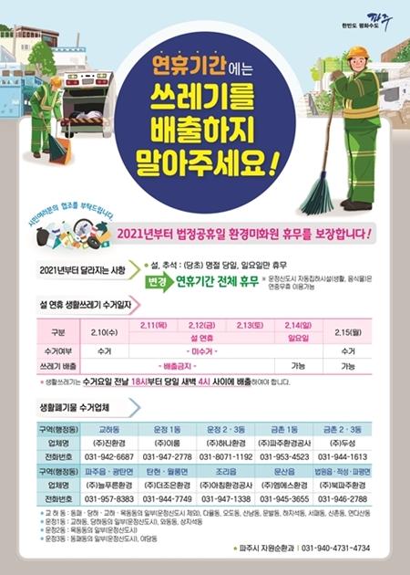 이에 따라 돌아오는 설 연휴기간에는 생활쓰레기를 수거하지 않는다. 시민들은 연휴 전날인 2월 10일 수요일부터 2월 13일 토요일까지 생활폐기물을 배출해서는 안 된다. 다만 운정신도시 내 자동집하시설이 설치된 지역은 평소처럼 집하시설을 통해 종량제봉투를 배출할 수 있다.