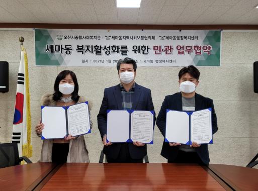 한진 오산종합사회복지관장은 “세마동 주민에게 각종 복지프로그램을 지원하기 위하여 민·관이 함께 힘을 모아야한다.”며, “특히 세마동의 복지대상자에게 다양한 서비스가 이루어질 수 있도록 노력하겠다.”고 말했다