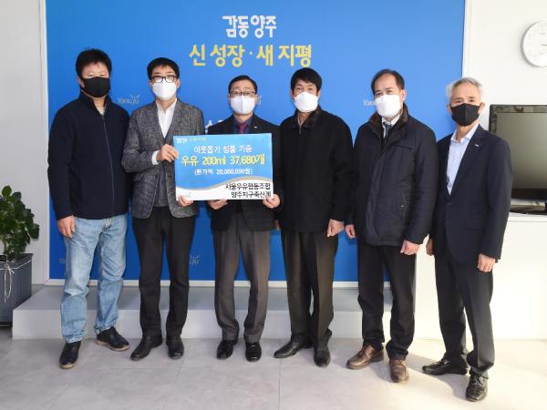 [KNT한국뉴스타임] 양주시는 지난 28일 서울우유협동조합과 서울우유양주지구축산계에서 양주시청을 찾아 관내 소외되고 어려운 이웃을 돕는데 써달라며 멸균우유 37,680개(환가액 2,000만원)를 기탁했다고 밝혔다.