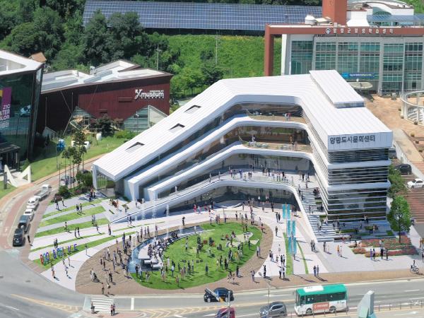 양평도서문화센터는 주변환경과 조화를 이루는 미래지향적 디자인으로 설계됐으며, 복합공간으로서의 활용성이 극대화 되도록 구상됐다.