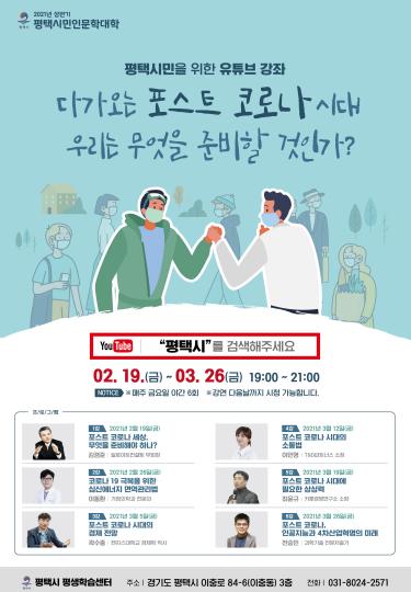 [KNT한국뉴스타임] 평택시는 오는 2월 19일부터 3월 26일까지 매주 금요일 총 6회에 걸쳐 평택시 유튜브를 통해 실시간 온라인 강연으로 상반기 평택시민인문학대학을 진행한다고 29일 밝혔다.