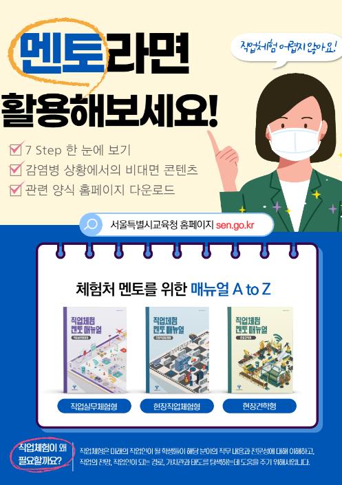 [KNT한국뉴스타임] 서울특별시교육청은 일터(체험처) 멘토의 역할 수행 지원 및 학생들의 진로탐색 기회를 확대하기 위해 「직업체험 멘토 매뉴얼」3종을 개발하여 보급한다.