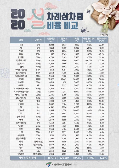 서울시농수산식품공사(사장 김경호, 이하 공사)는 알뜰한 설 명절 준비에 도움이 되는 정보를 제공하기 위해 서울시내 25개구 전통시장, 대형마트 및 가락시장 내 가락몰 등 총 76곳을 대상으로 2020년 설 차례상차림 비용을 조사.발표하였다.