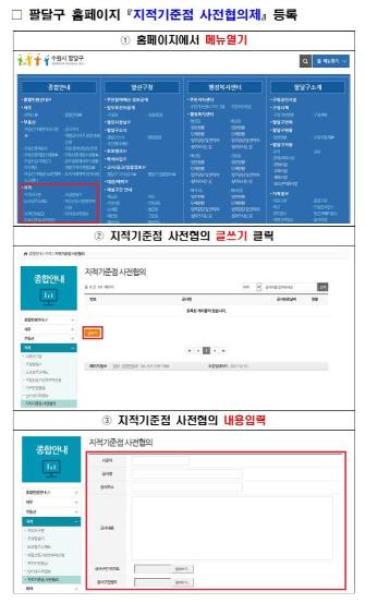 기존에는 도로굴착 및 포장 관련 공사를 시행하는 경우 구청을 직접 방문해 공사 구간 내 지적기준점의 여부를 확인하는 등 번거로운 절차를 거쳤다. 앞으로 홈페이지를 이용한 비대면 ‘지적기준점 사전협의제’를 통하여 구청 방문에 따른 시간과 비용을 절약해 보다 신속하고 정확한 업무를 진행할 수 있다.
