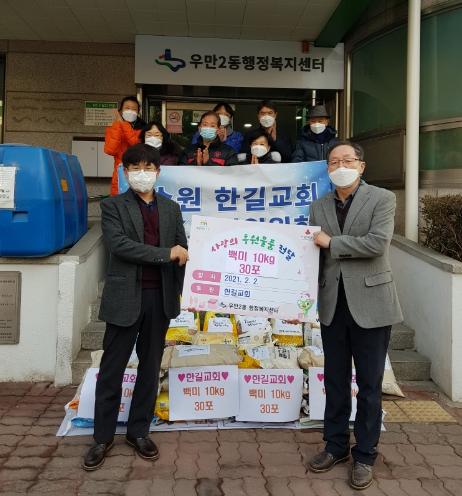 [KNT한국뉴스타임] 한길교회에서는 지난 2일 설 명절을 맞이하여 팔달구 우만2동 행정복지센터에 불우한 이웃을 돕기 위해 백미 10kg 30포를 기탁했다.